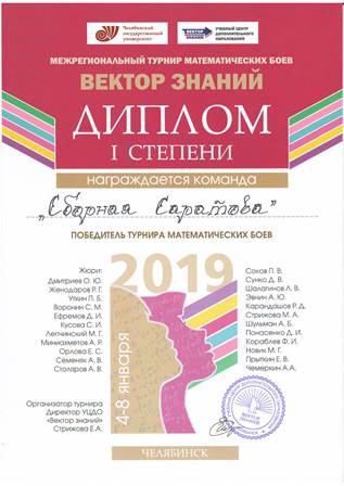 В первые дни января сборная юных математиков города Саратова привезла Диплом 1 степени с Межрегионального Турнира математических боев «Вектор Знаний-2019».